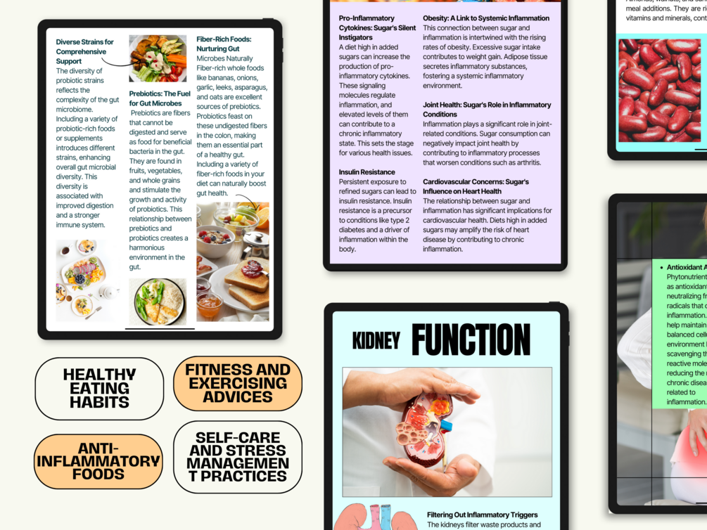 Healthy eating guide, intermittent fasting practices, sleep and mindfulness tips, how to manage stress and anxiety and simple benefits of exercises on inflammation.