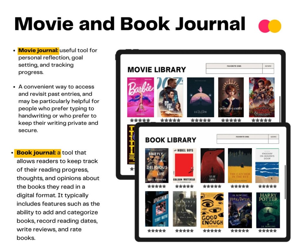 The planner includes templates for a monthly and weekly calendar, where you can easily schedule your appointments and tasks. It also features a movie and TV/shows and book journal where you can keep track of what you've watched,/read your ratings, and notes.