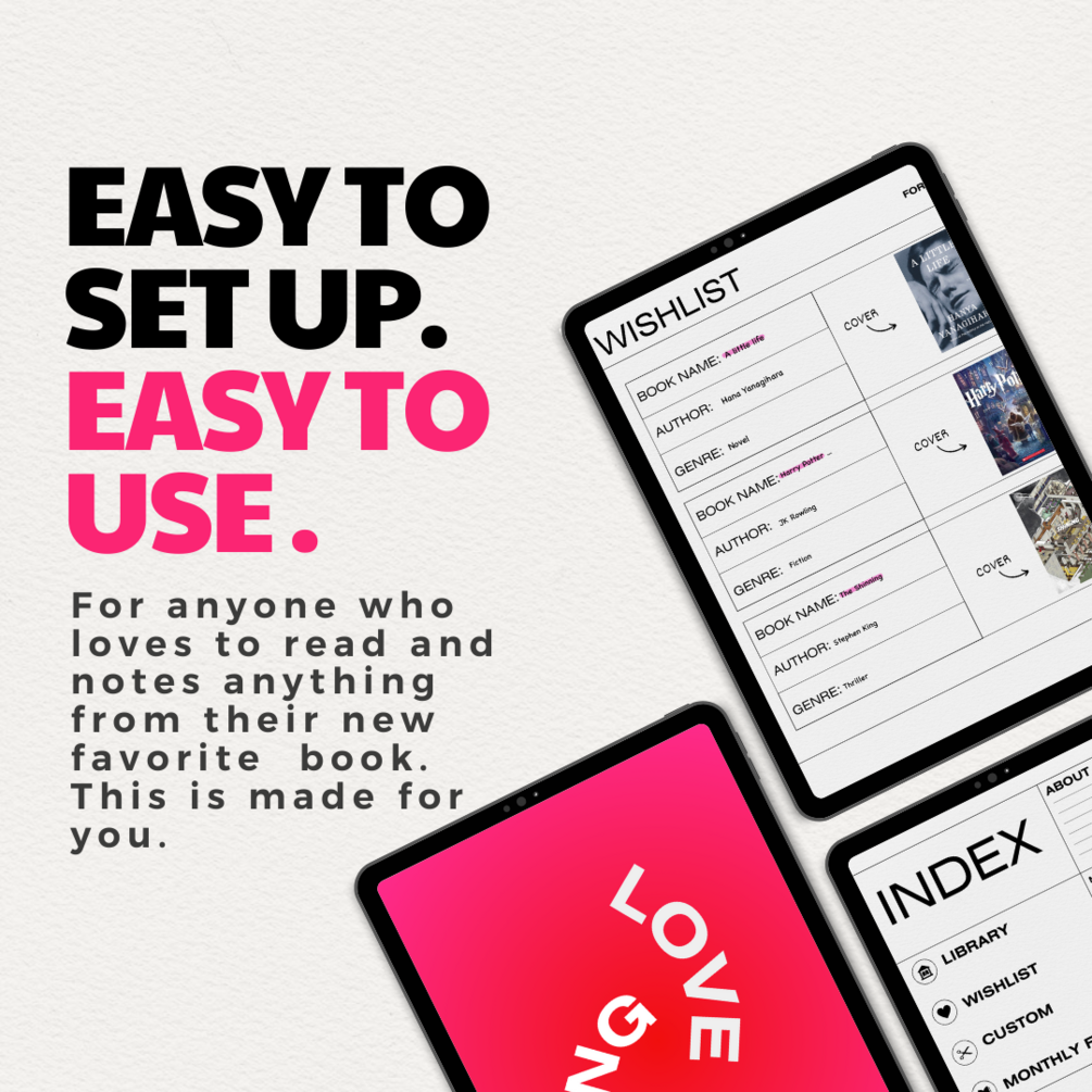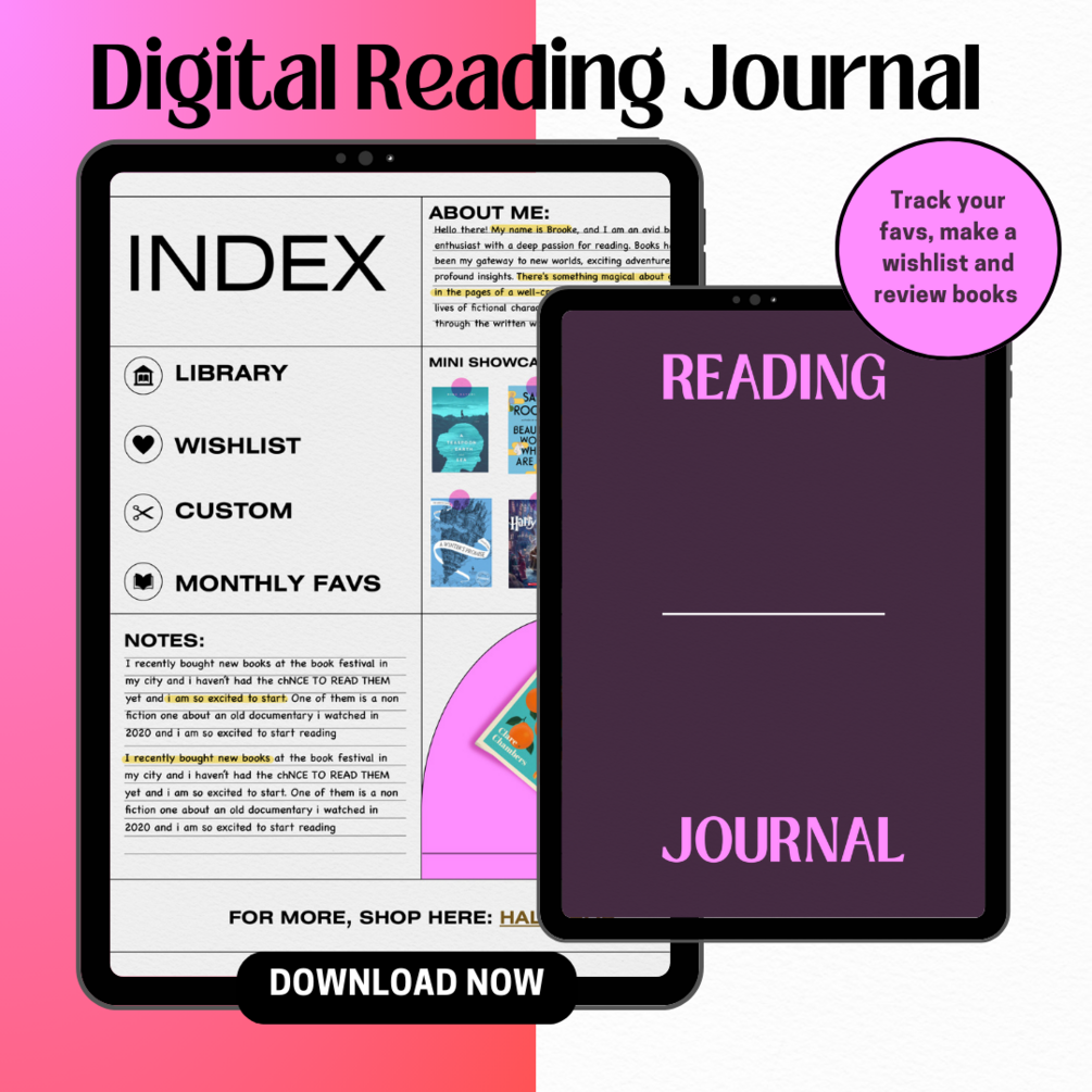 Discover the perfect digital reading journal on Etsy! Stay organized with book wishlists, track your monthly favorites, book shelf / digital library and enjoy custom pages tailored to your reading journey. With a user-friendly hyperlinked index, navigating your journal has never been easier. Enhance your reading experience today with our exceptional digital reading journal. This is the perfect gift to any book lover out here! Enjoy.